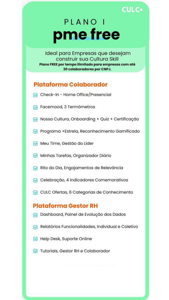 O Plano PME é gratuito e ilimitado para empresas que tenham de 11 a 30 funcionários por CNPJ. Nosso propósito na CULC é impulsionar o crescimento e a eficácia dos pequenos negócios contribuindo para a construção de sua Gestão de Pessoas e sua Cultura de Pertencimento.