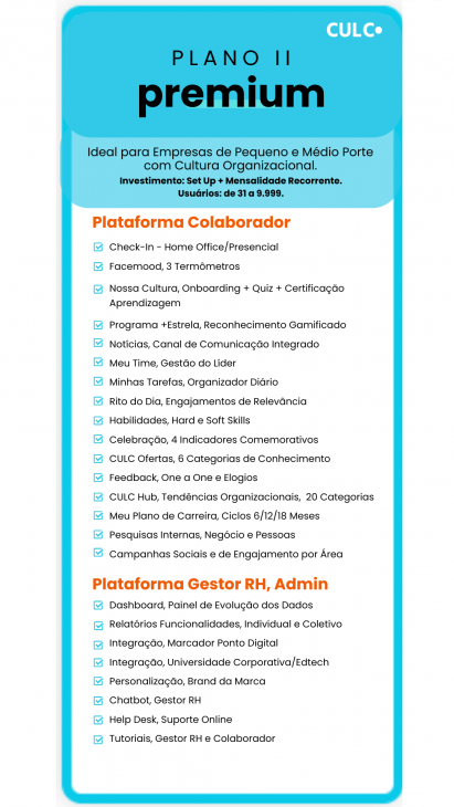 O Plano Premium oferece uma assinatura paga da CULC, ideal para empresas que buscam ampliar sua gestão de pessoas e cultura organizacional.